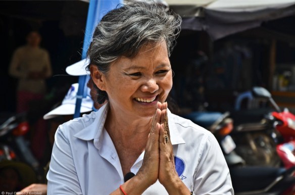 The campaign convoy started near Psar Nath, one of Battambang’s main markets, and wound its way through the streets. Mu Sochua stopped a few times at other streetside markets to give speeches and meet with local people before moving to a temple several kilometres from town for a refreshment break.